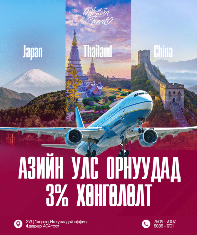 Мөрөөдлөө биелүүл Page · Travel Company Khan-Uul district, 1st khoroo, Ikh Khuraldai Business Center, 4th floor, 404, Ulaanbaatar, Mongolia +976 7509 7007 contact@westerntravel.mn